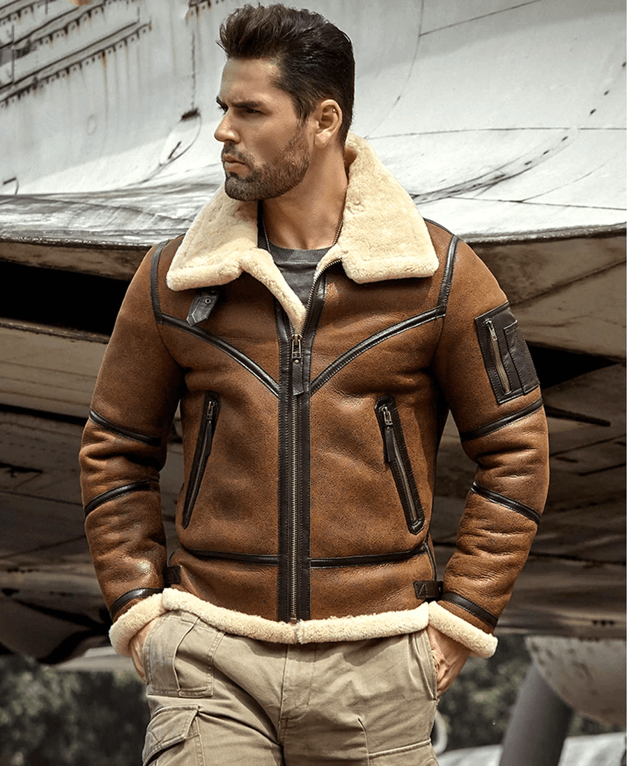 Classic Aviator Design: Shearling/fur collar, ribbed cuffs, and hem