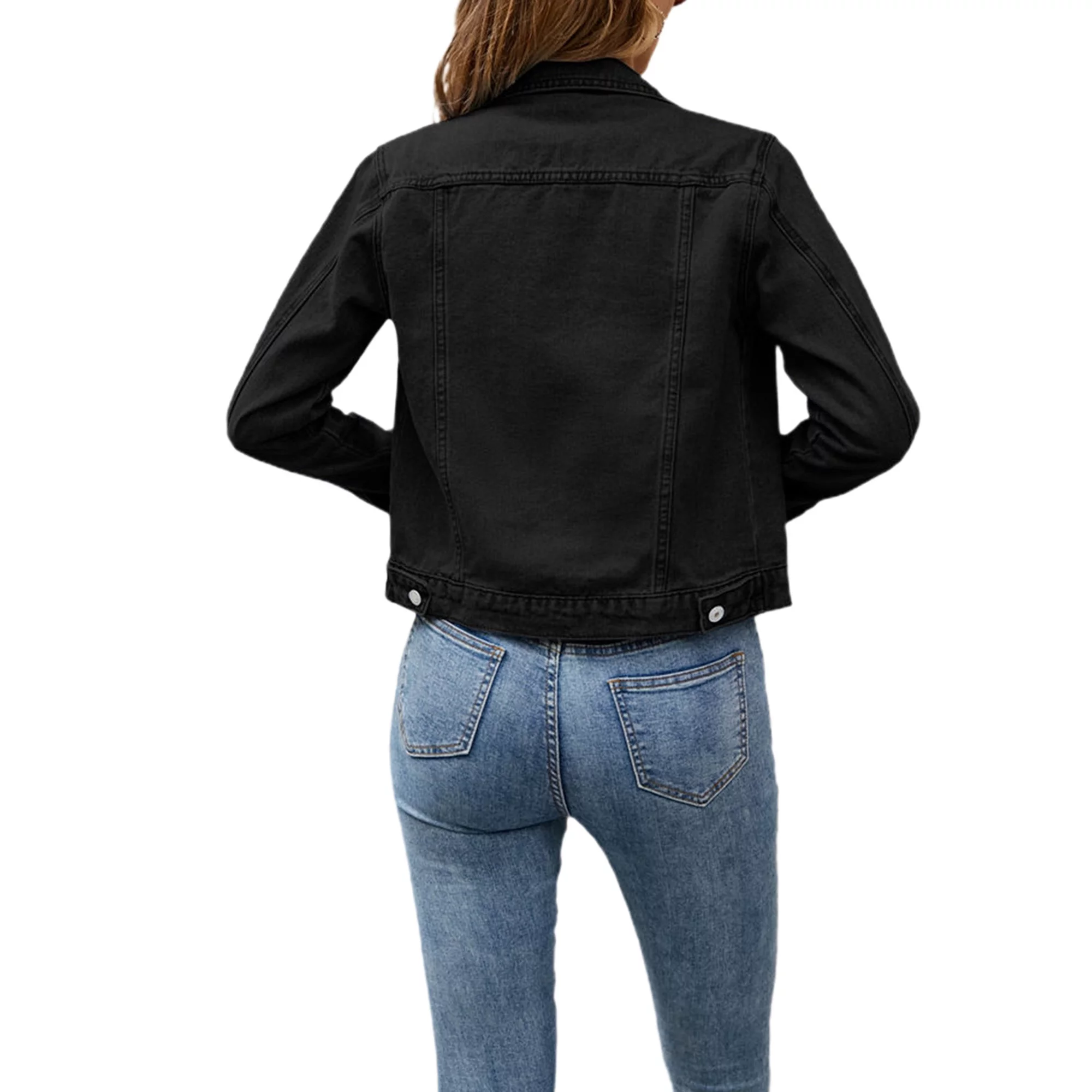 The Black Denim Womens Jacket pairs effortlessly with a variety of outfits. Wear it over casual T-shirts and jeans for a relaxed look, or layer it over dresses for a polished, chic appearance. Its tailored cut ensures comfort while maintaining a stylish, structured silhouette.