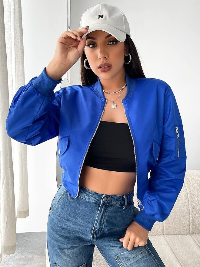 The Blue Cropped Bomber Jacket is a chic and versatile outerwear piece designed for women who want style, comfort, and a modern edge. Its cropped silhouette adds a youthful and trendy touch, making it perfect for layering over casual outfits or pairing with high-waisted pants and skirts. The vibrant blue tone adds a pop of color to your wardrobe, creating a bold yet sophisticated statement wherever you go.